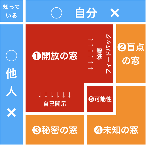 ▲ジョハリの窓をご存知でしょうか? 自分には自分も他人も知っている自己(①)、自分が気づいていない他人からみた自己(②)隠された自己(③)、自分も他人もまだ知らされていない自己(④)があると言われています。